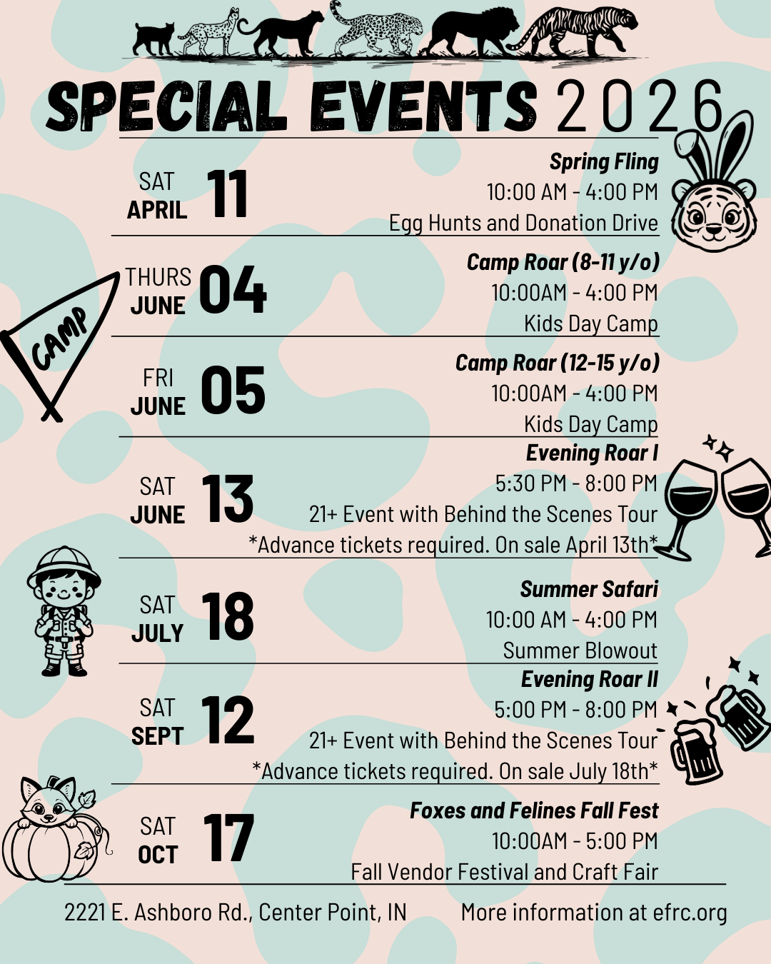 Welcome to the Exotic Feline Rescue Center (EFRC) in Center Point, IN. Since our founding in the early 1990’s, the EFRC has served as a rescue center and forever home to many exotic felines that have been abused, unwanted, or neglected. The Exotic Feline Rescue Center has grown from its humble beginnings with only three exotic felines to today caring for over 200 animals, representing over twelve different species, and from 15 acres to over 300 total acreage. As a 501c-3 nonprofit rescue center, we do not breed, sell, or buy any of our animals and next to caring for these amazing animals, our biggest job is educating the public about the plight of these creatures.