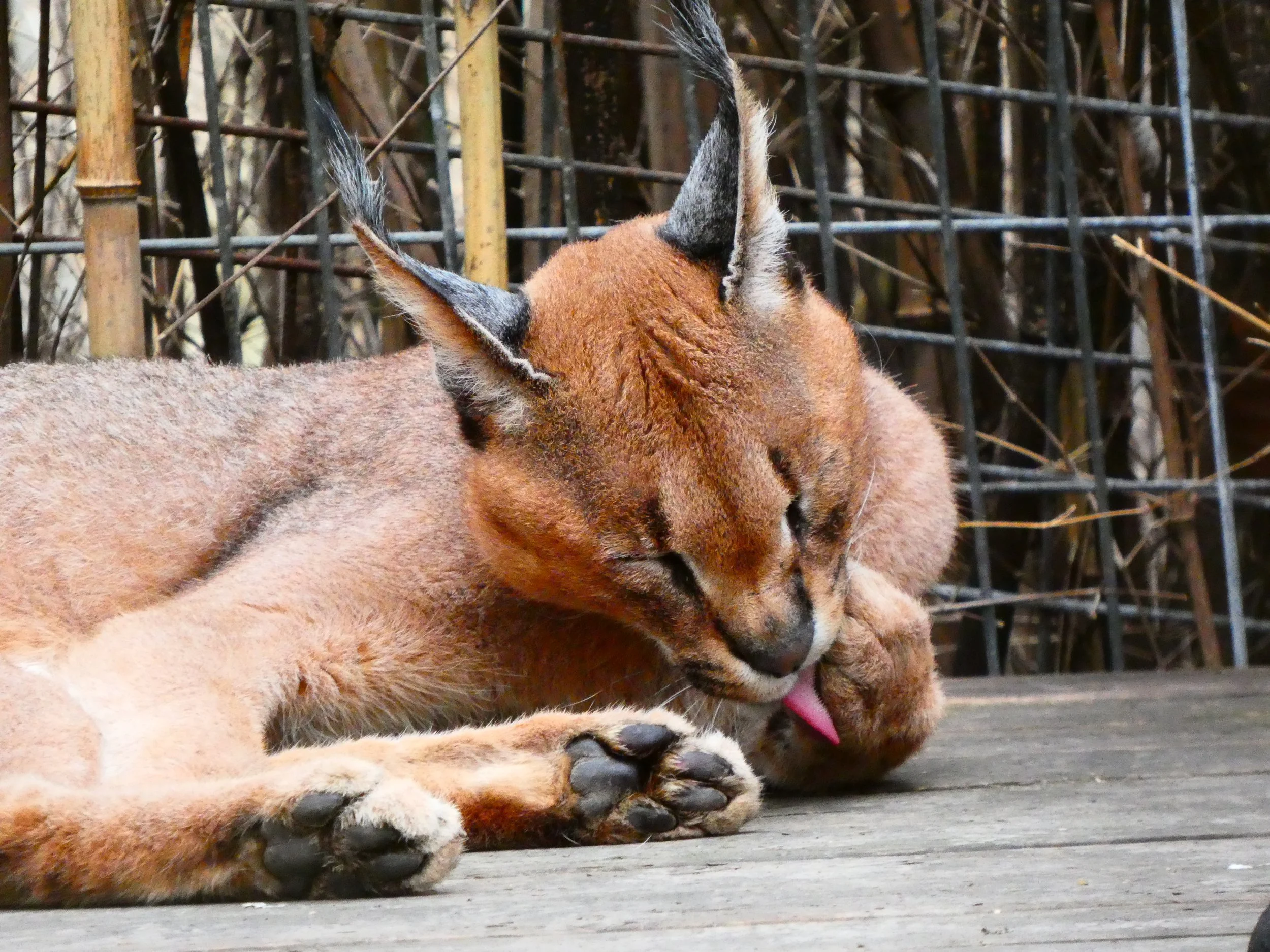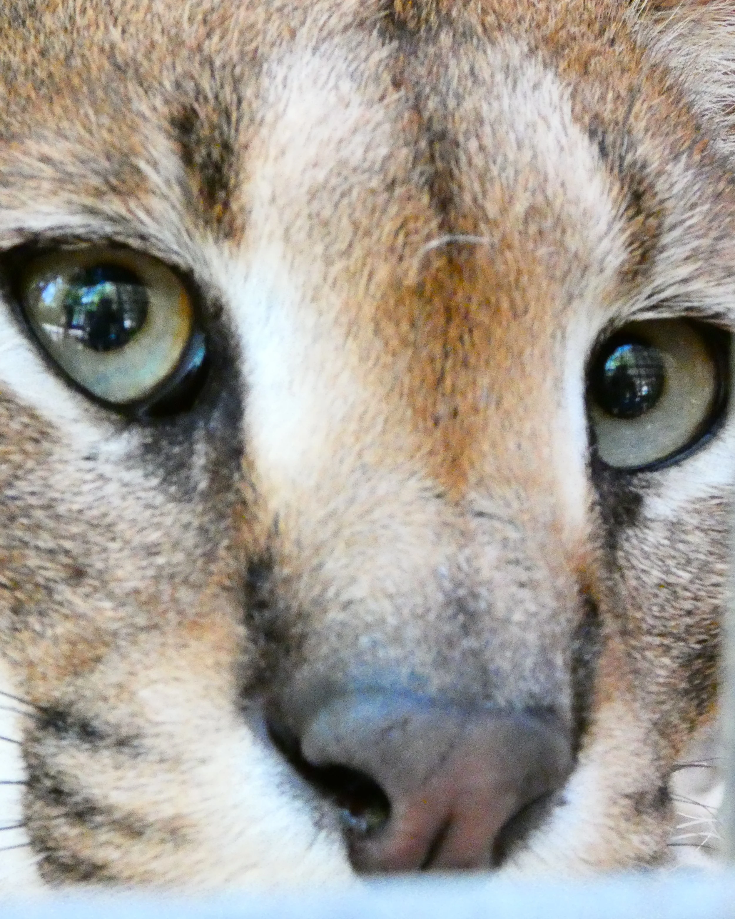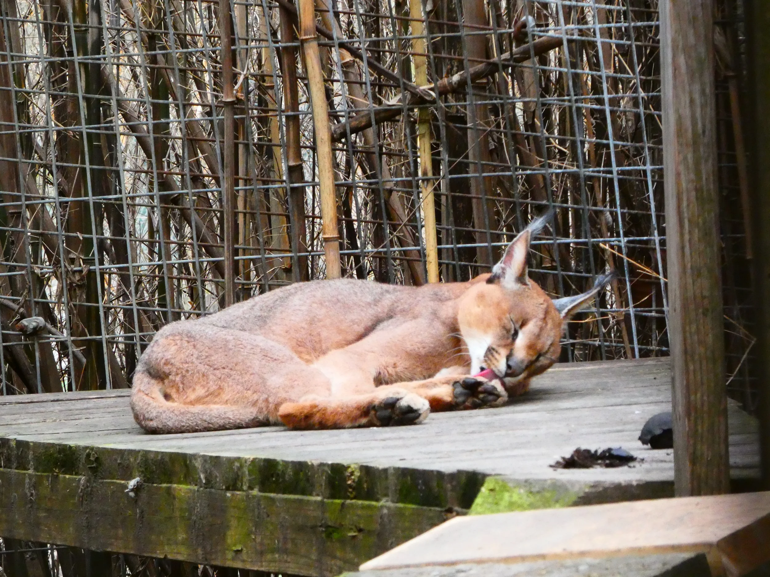 Jinx was surrendered by a private owner. Our keepers drove down to Kentucky to pick him up. We were able to introduce him to one of our other caracals, Fire. The two live right next to the front booth and can often be seen hanging out and cuddling while guests wait for tours to begin.