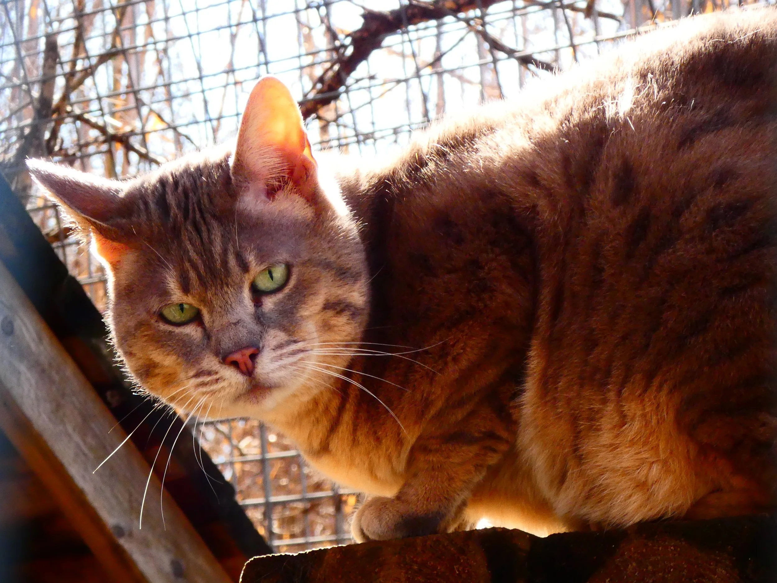 Aylaa was surrendered to the EFRC by a private owner alongside Veda. She is a Savannah cat, which is a hybrid between an African serval and a domestic house cat. She looks a lot like a house cat because she is a later generation Savannah. These later generation hybrids can still have behavior issues and are often surrendered because of them.