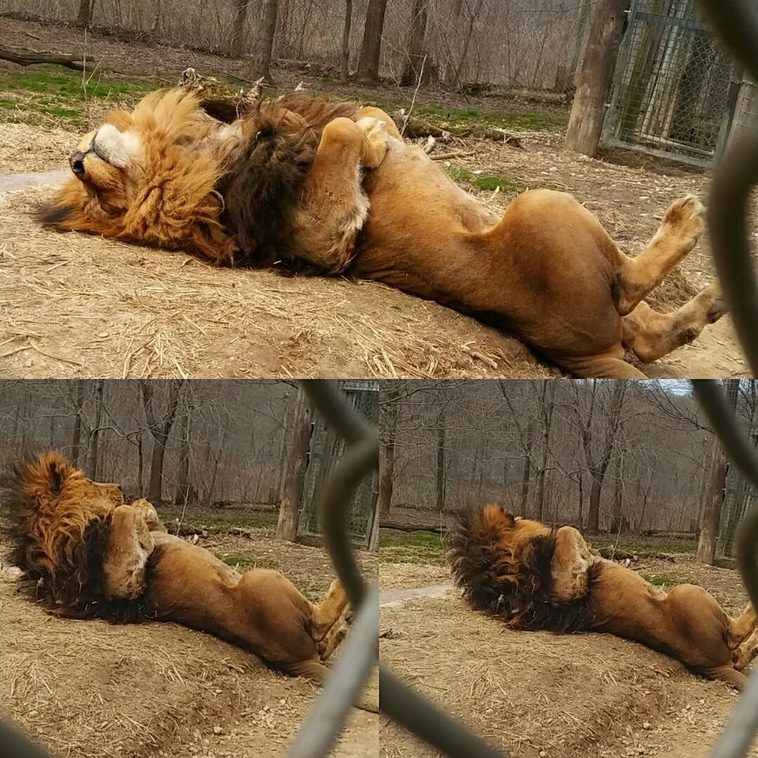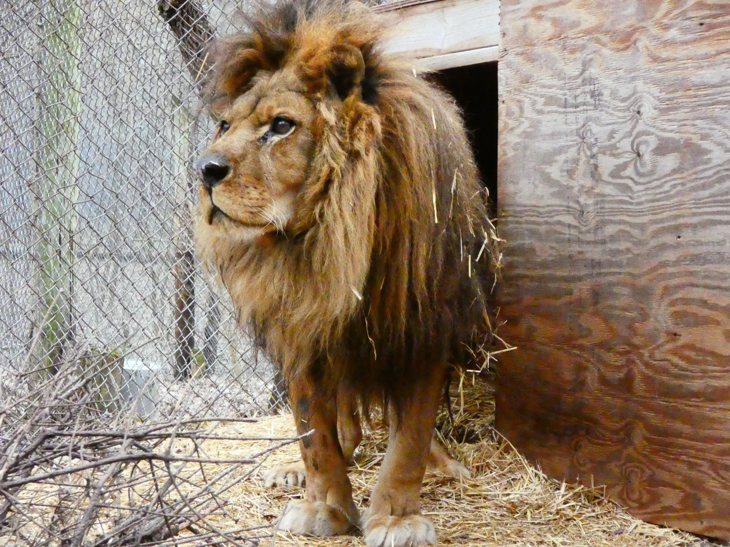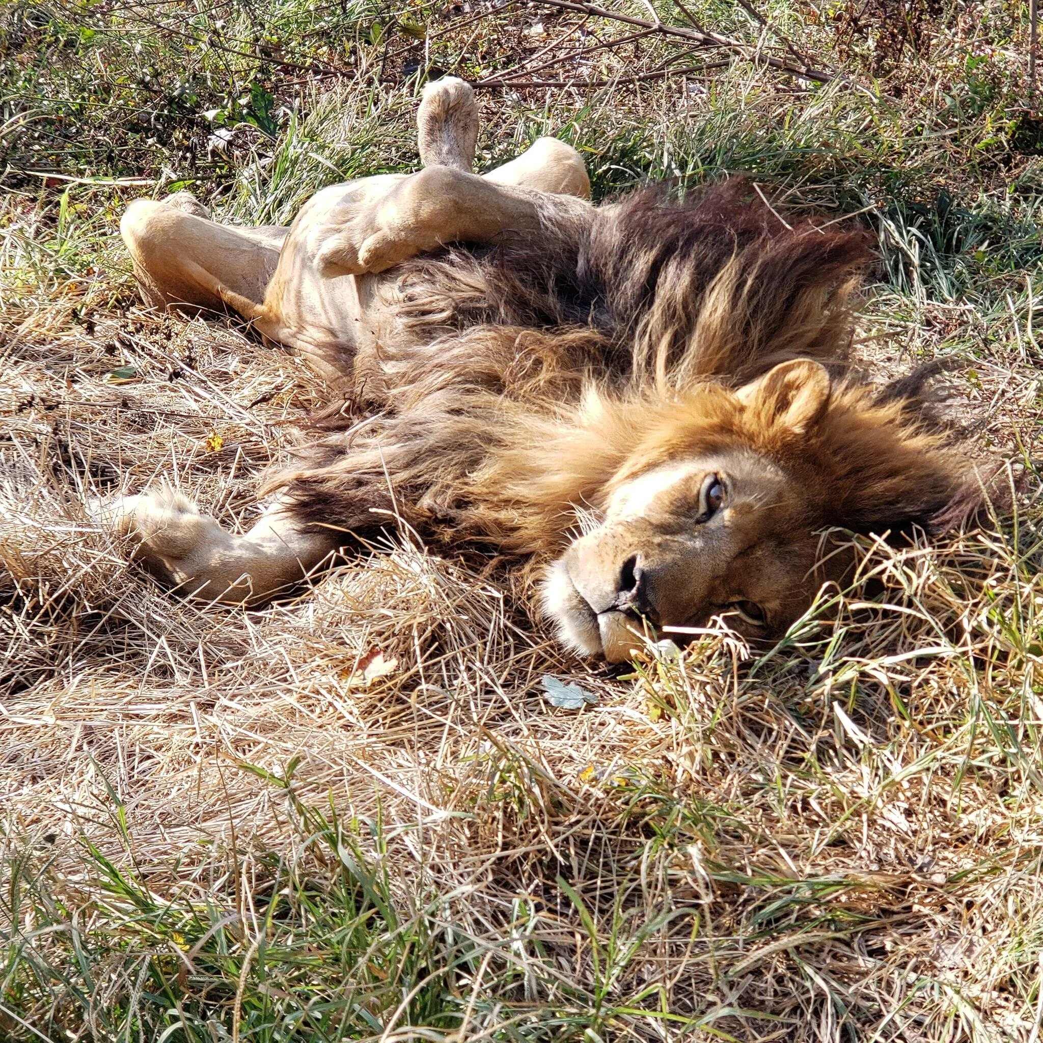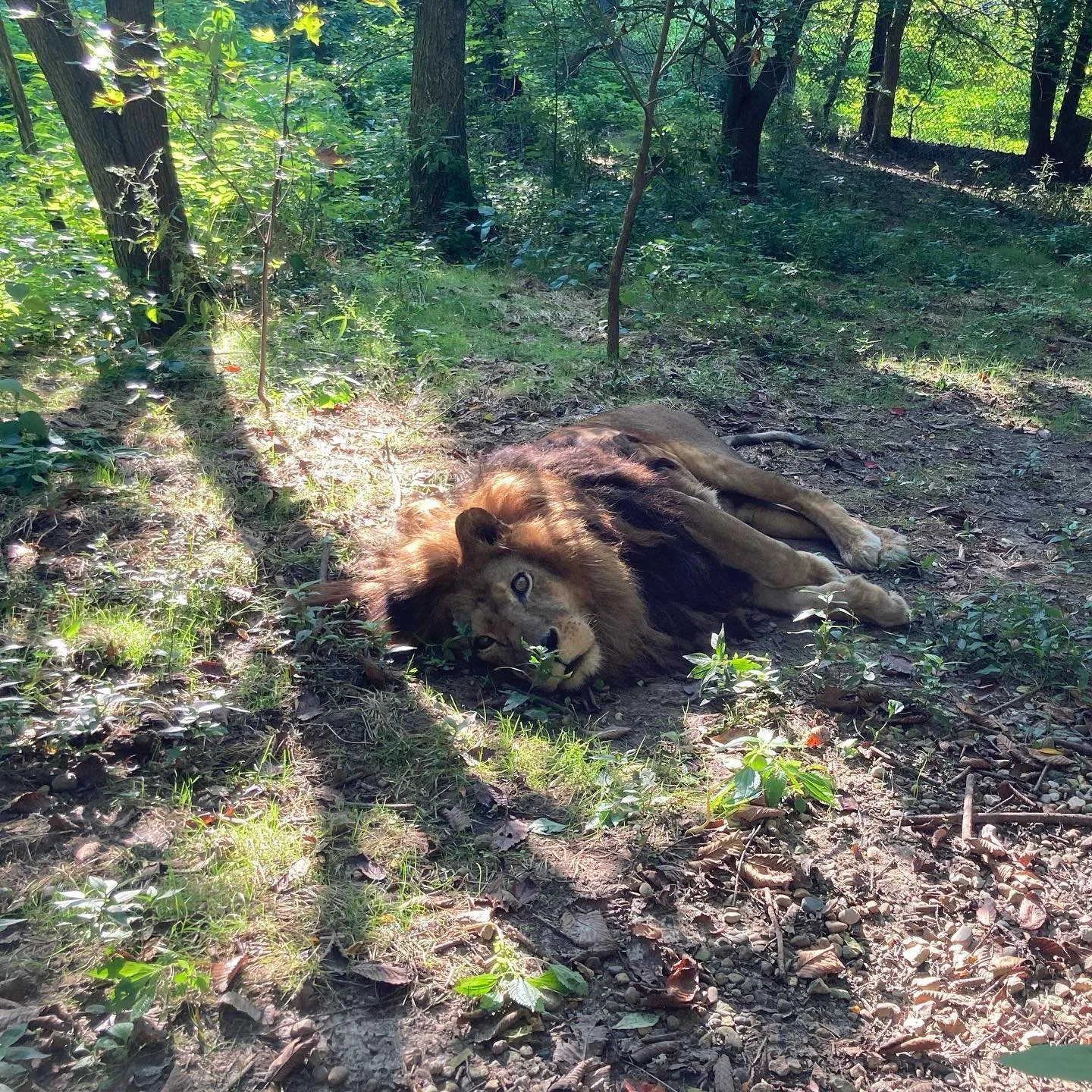 An animal trainer in the Miami County Circus in Peru, IN retired from the circus. Upon retirement, the trainer took the many animals he owned and placed them in a single barn. Not only were tigers kept in this barn, but also lions, horses, and an elephant. The horses had the stables, the elephant had one half of the barn, and the big cats were confined to circus cages in an area in front of the stables. The lions’ manes were matted from sitting in their urine and feces for such a long time. After 9 years in that barn, the animals were rescued. Upon arrival in 2010 at the Rescue Center, Zeus and his brother, Thor, could barely walk and were very weary of the small shovels we use to scoop poop. Years later though, one of Zeus’ favorite things to do is run! He loves to run with keepers and volunteers along his fence line. Unfortunately, Zeus lost his brother a couple of years ago due to age related health issues, but Zeus has been able to keep a strong bond with his keepers. Zeus also loves to lay out in the sun and rub his tummy, but you have to be careful watching him too long as he will let you know when it is time to move on.