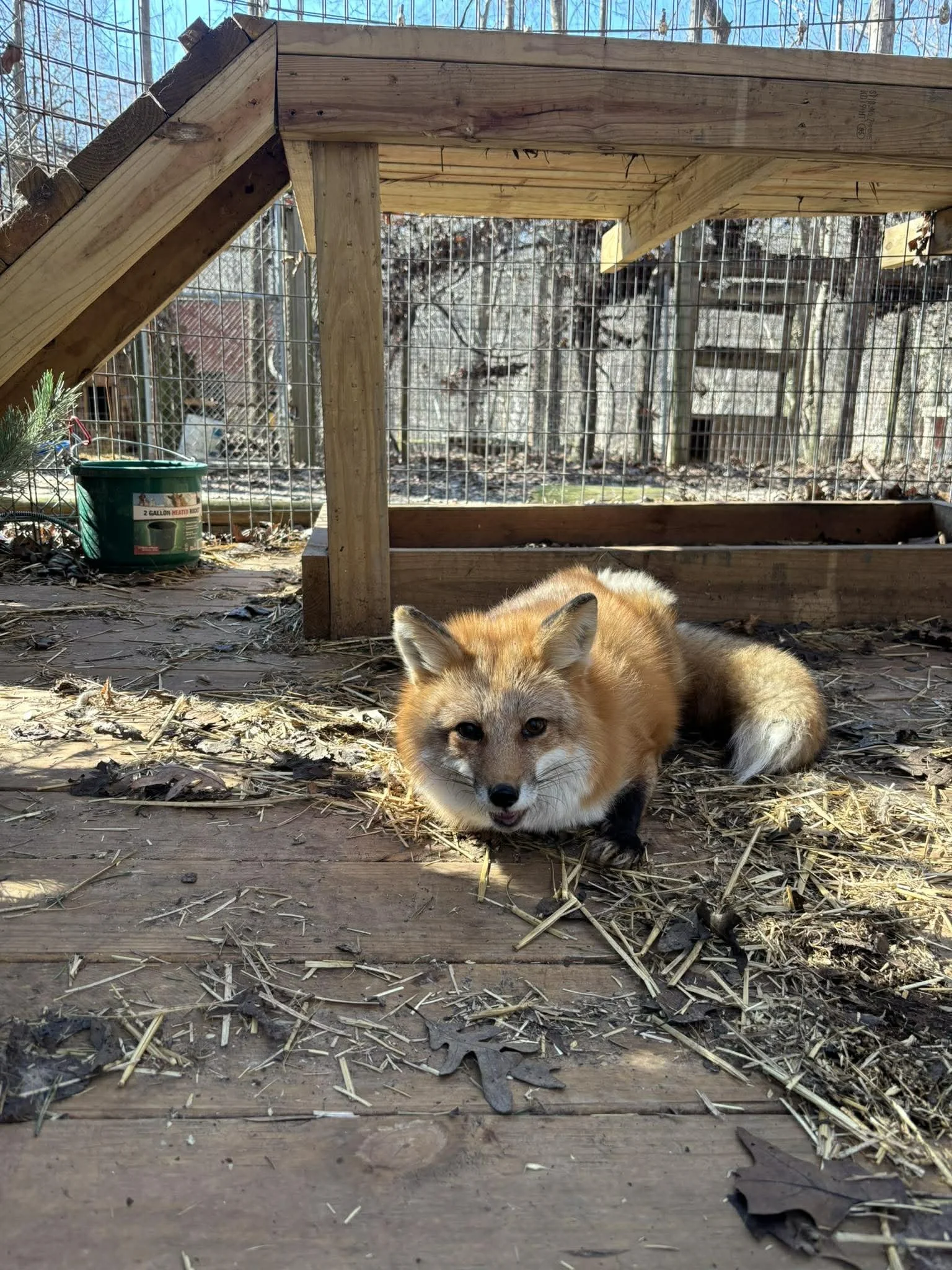 Emily was rescued from a fur and urine farm in Ashtabula, Ohio in 2025. More information on this rescue can be found here. She can be found just off tour with four other red foxes from the same rescue: Nyx, Aero, Peter, Pollux, and Pepper.