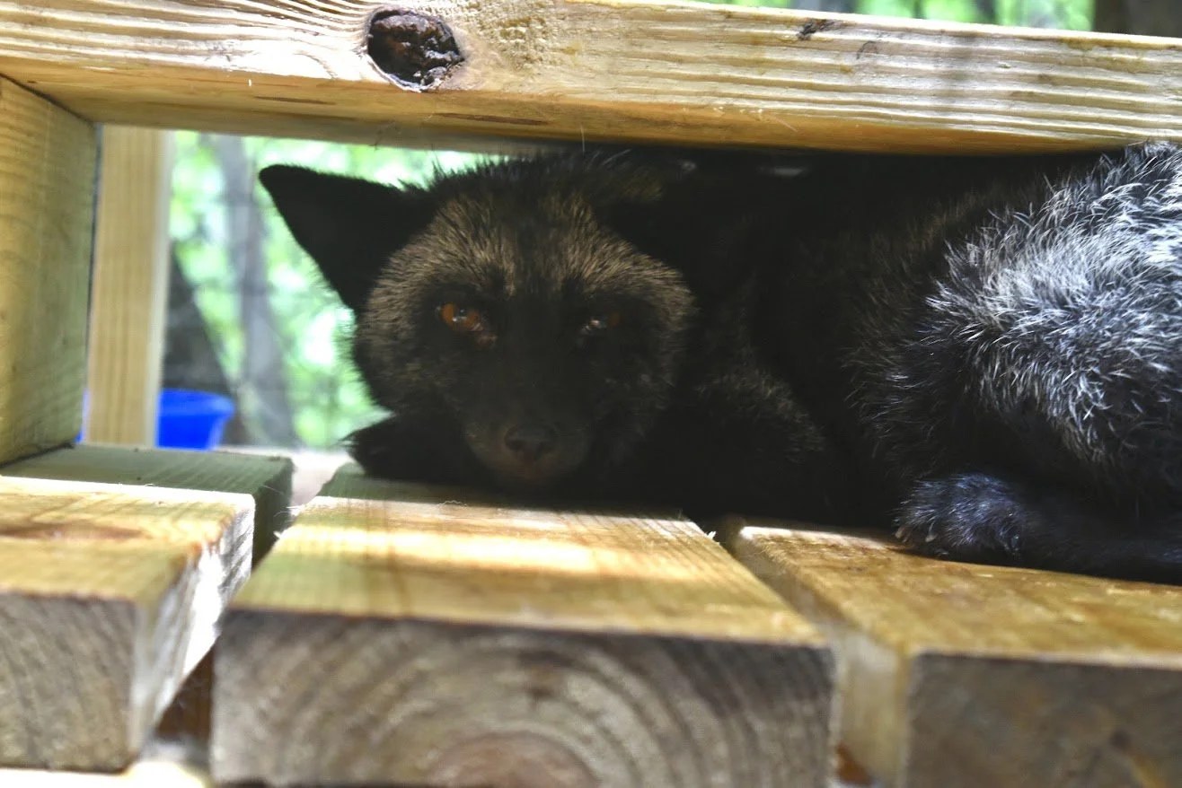 Farfalla was rescued from a fur and urine farm in Ashtabula, Ohio. More information on this rescue can be found here. She can be found just off tour with four other red foxes from the same rescue: Puck, Papillon, Dottie, and Mr. Pibbs. “Farfalla” is Italian for “Butterfly”.