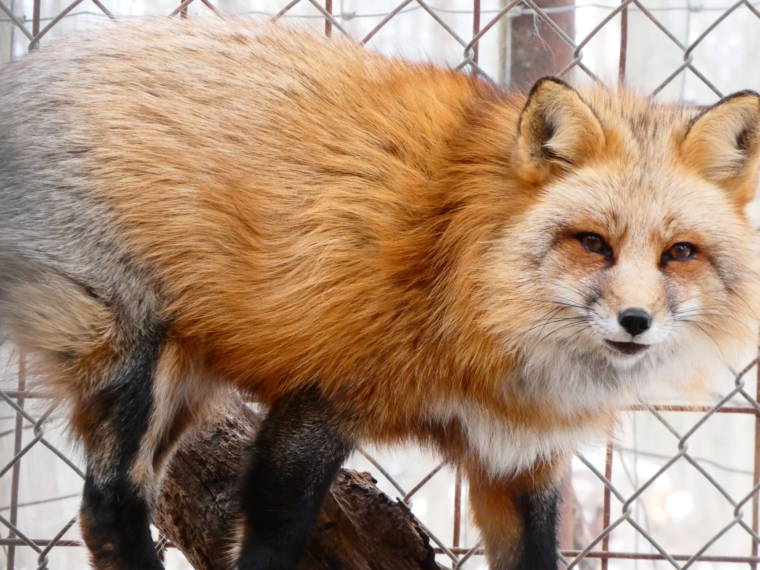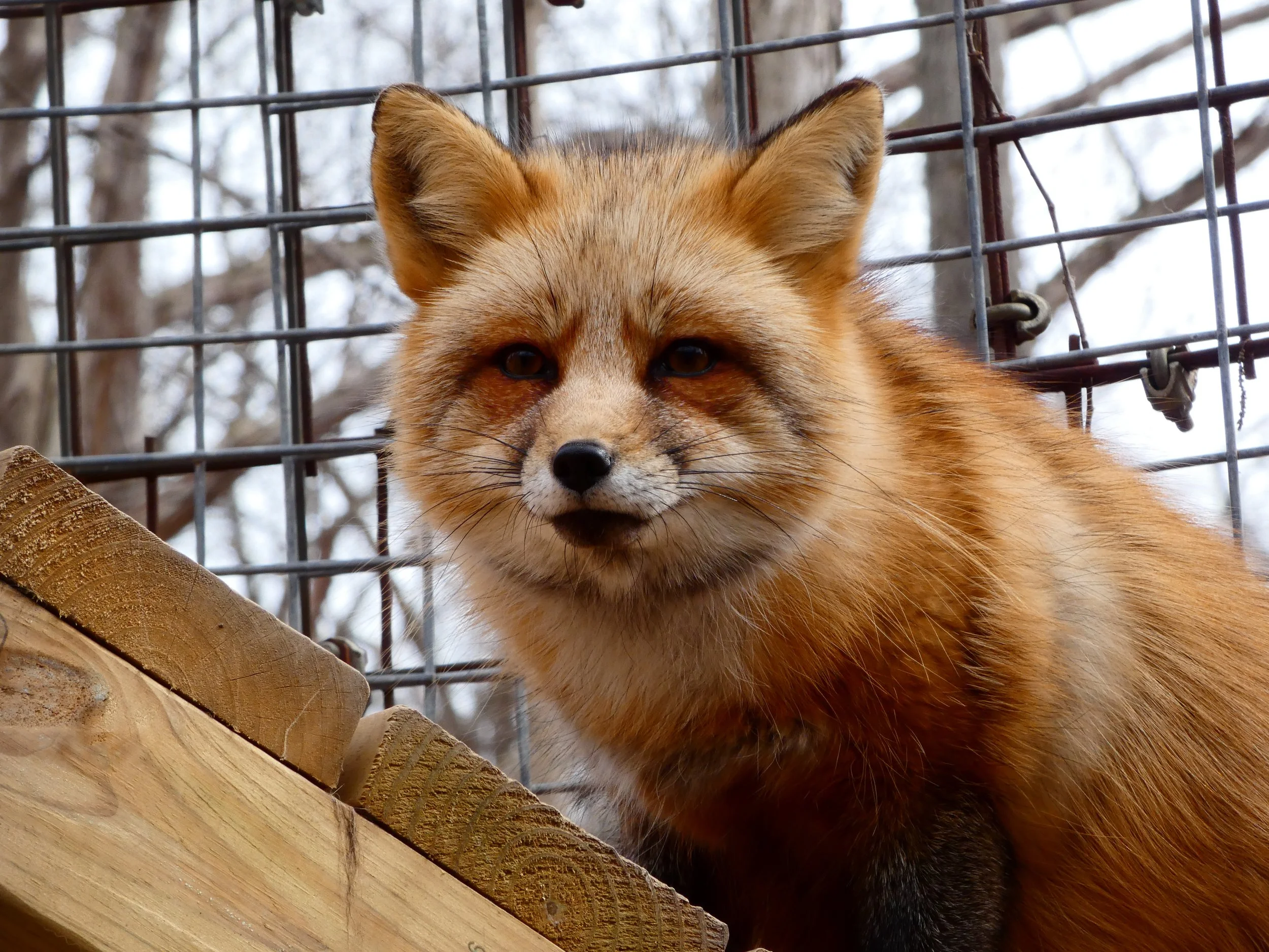 Sakura was rescued from a fur and urine farm in Ashtabula, Ohio in 2025. More information on this rescue can be found here. She lives in a group with four other foxes from the Ashtabula rescue: Cooper, Zephyr, and Halo.