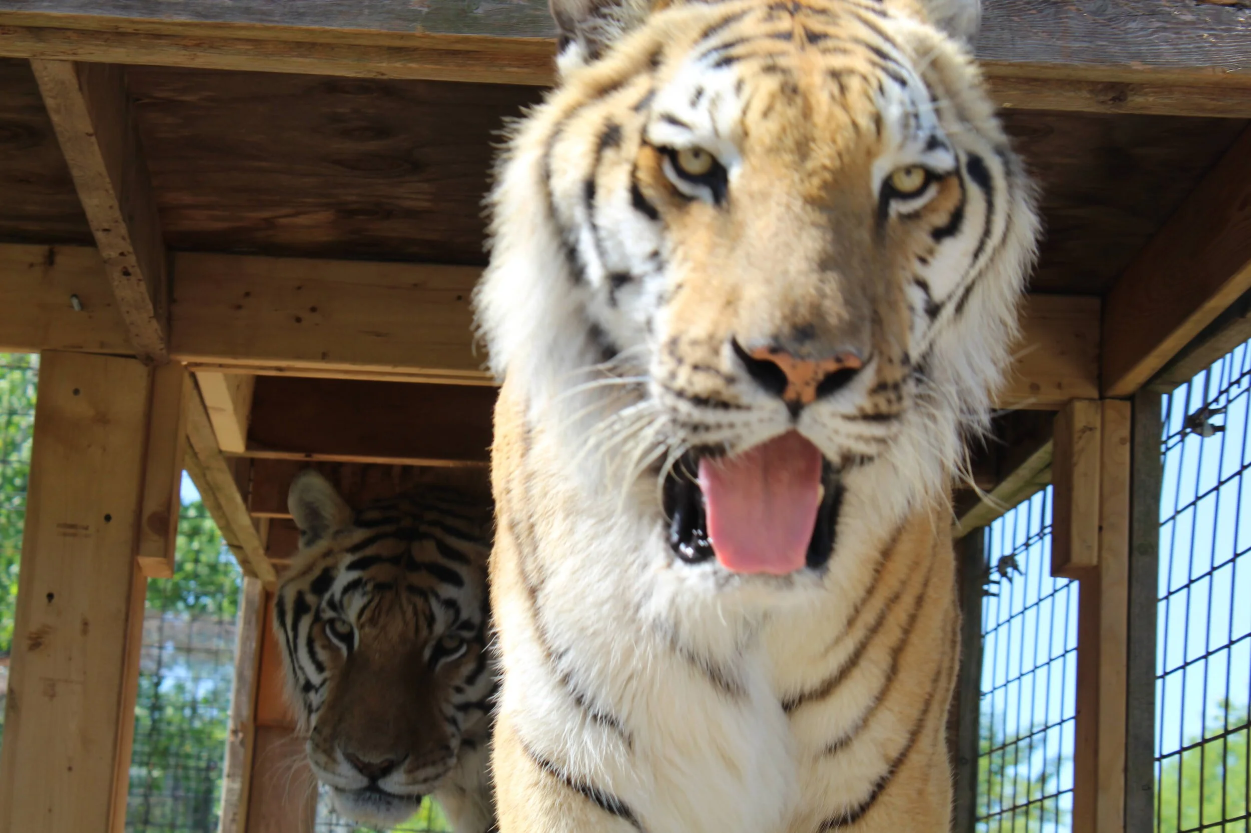 Riley arrived in 2019 from a facility in California called Wildlife Waystation. Their Board of Directors had voted to surrender the facility’s California Department of Fish and Wildlife permit voluntarily and to close the facility. The facility had suffered through two wildfires and a flood. Overall, we rehomed 15 cats from Wildlife Waystation. Four pumas, six tigers, and five lions were brought to the rescue center over two trips coordinated by the foundation Tigers in America and a fellow rescue, In-Sync Exotics out of Wylie, TX. Riley is a very social boy who loves to come over and see what is going on. In the evening, he can often be seen still munching or even playing with his leftovers.